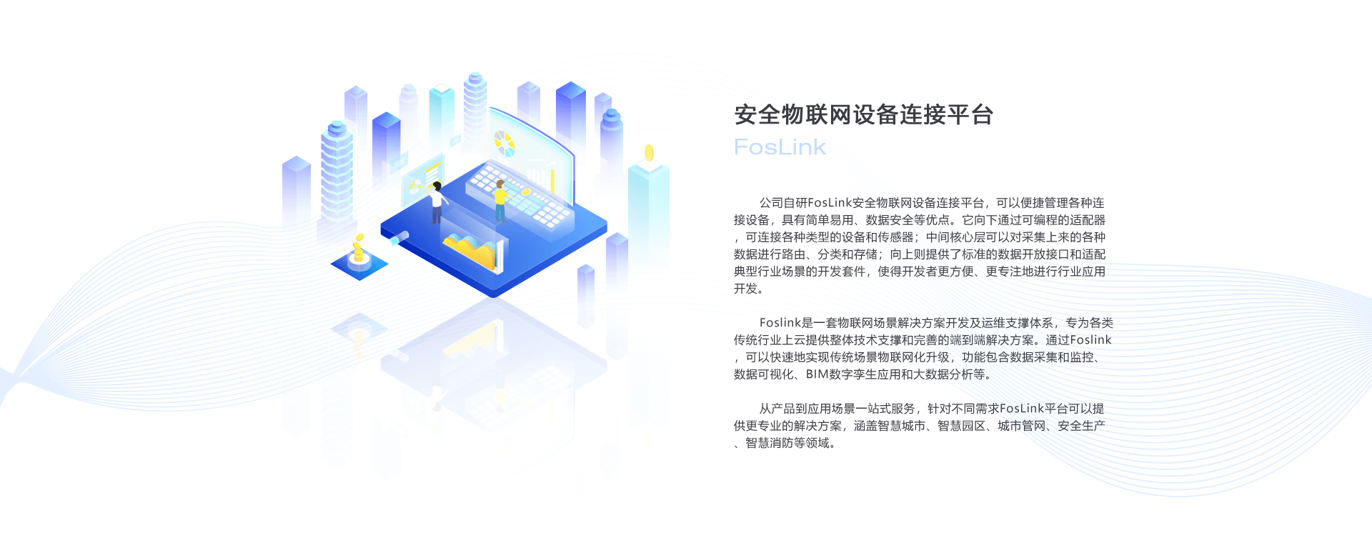 從產(chǎn)品到應(yīng)用場景一站式服務(wù),針對不同需求FosLink平臺可以提供更專業(yè)的解決方案,涵蓋智慧城市、智慧園區(qū)、城市管網(wǎng)、安全生產(chǎn)、智慧消防等領(lǐng)域。